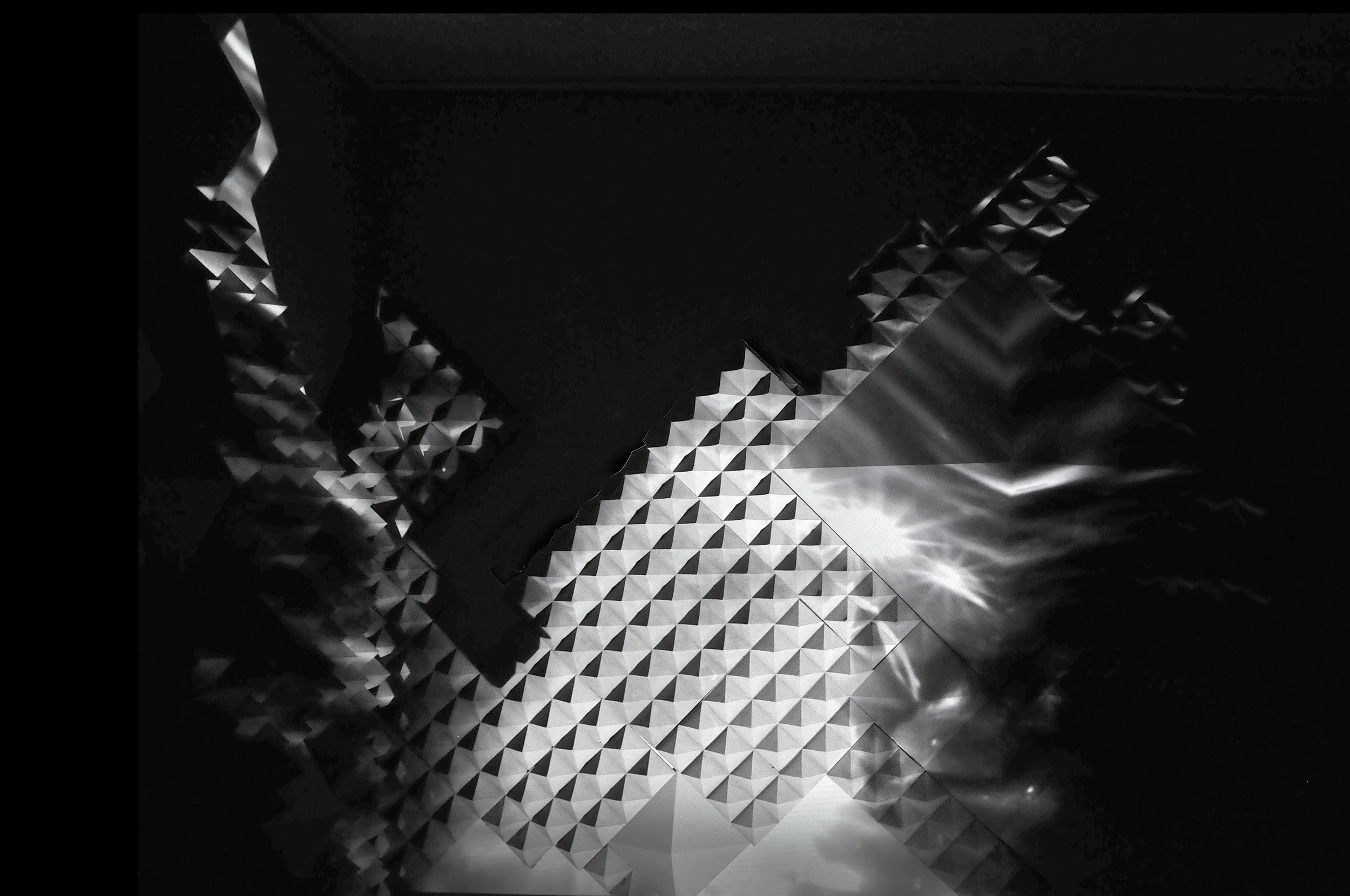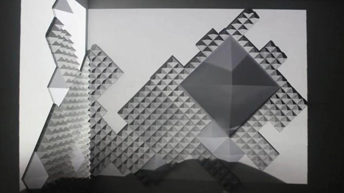 Bare Branches is a projection mapping piece that plays over a pyramidical foam and acrylic wall sculpture. The projections depicts birds in flight and a dune-like female body silhouetted against discordant geometric shapes. The projection plays on a three-minute loop; Visual elements are slowly revealed and then hidden again by a series of black squares. These ever-changing images and the interplay of light and shadow tie together with the abstraction and EMERGENCE of the femaLE form.